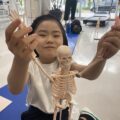 体験ではまず、骨格標本などを自由に動かしながら、「骨、筋肉、関節」の仕組みについて学んでいきます。「骨って何本あるの?」「走るときに使うのはどこかな?」普段はなかなか触ることができない人体模型を、この日だけは好きなだけ動かし放題!