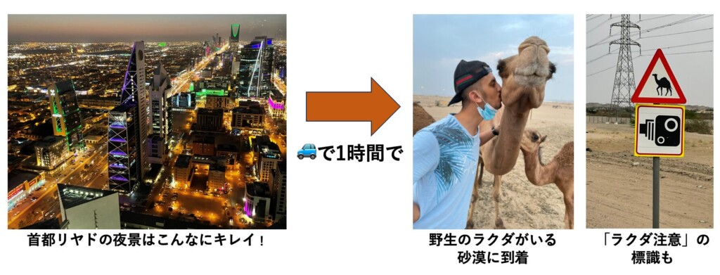 「みんな、砂漠だらけのイメージがあると思うけど、首都のリャドはこんなにキレイ」と見せてくれた写真に、みんなは「うわ〜、行ってみたい」「夜がすごいね!!」と大感激。でも、その都会から車で1時間走ると野生のラクダがいる砂漠もあるそうで、色々な顔がある国なんですね。