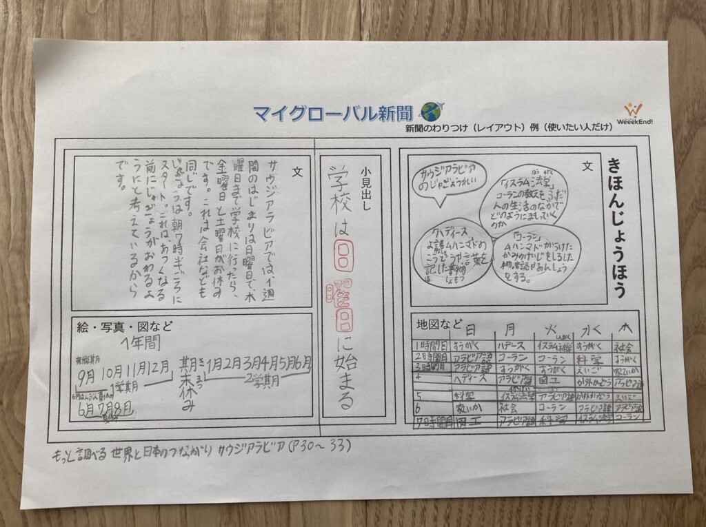 【サウジアラビア】初めての新聞づくり、楽しかったです!表・ふきだしなど、伝え方を工夫してみました(3年生女の子)