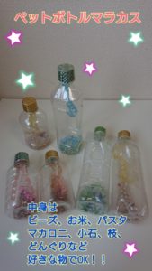 ペットボトルマラカス(作れる子は作ってみてね) または、おうちにある打楽器(カスタネット、タンバリンなど)