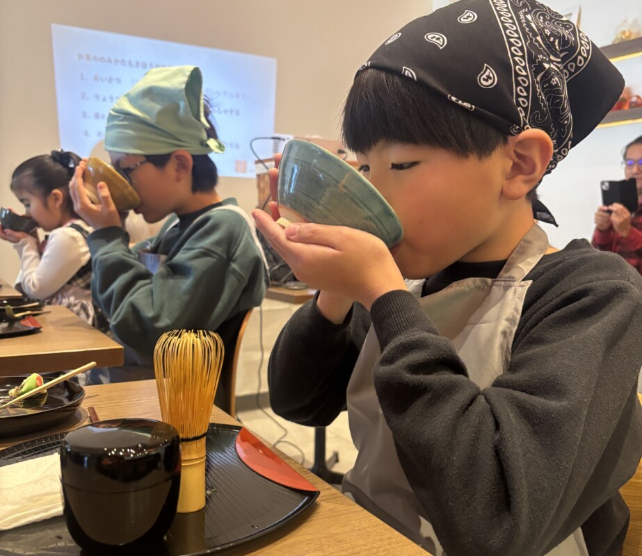 「茶道体験」では、保護者の方も一緒に、基本の道具名称や動作、点て方、飲み方まで一連の流れを体験しながら学んでいきます。初めて茶道にふれる子も、茶道を習っている子も、それぞれが自分のペースで参加することができます。子どもたちは、大人が思っている以上に、落ち着いた「静の時間」を楽しめるんです!自然と背筋が伸びる時間はとても気持ちがいいもの。苦そうなお抹茶ですが、「おいしい」と味を楽しめる子も。