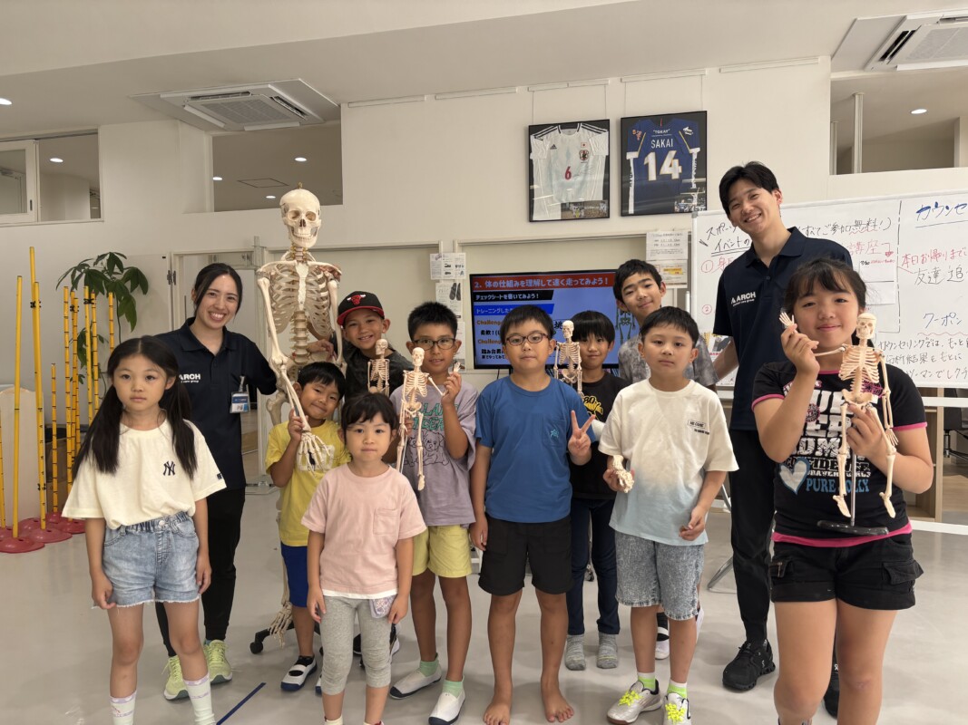 体験ではまず、骨格標本などを自由に動かしながら、「骨、筋肉、関節」の仕組みについて学んでいきます。「骨って何本あるの?」「走るときに使うのはどこかな?」普段はなかなか触ることができない人体模型を、この日だけは好きなだけ動かし放題!